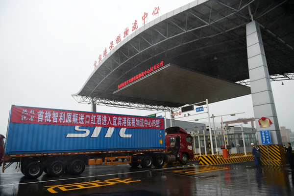 装载着从智利原瓶进口红酒的卡车驶入保税物流中心(王宇摄)