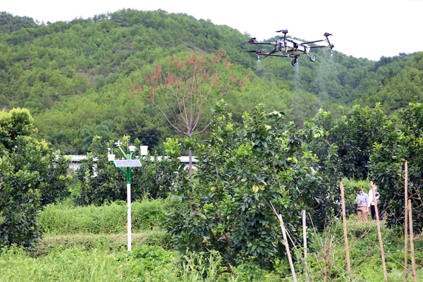 无人机在金柚种植园演示喷洒安全农药操作(黄裕勇摄)