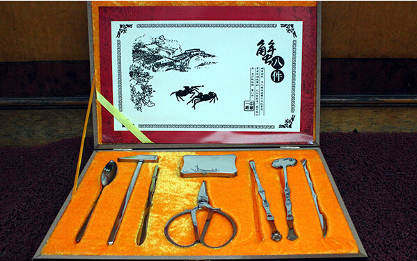 不過,要真正做到讓吃過的蟹殼就像一只沒吃過的蟹,還得用“蟹八件”不可。在茶道中,有人分出“文飲”與“武飲”,講的是品賞。而食蟹,如果也分“文食”與“武食”的話,那麼,用“蟹八件”吃蟹就是“文食”。據《考吃》記載:明代初創的食蟹工具有小方桌、腰圓錘、長柄斧、長柄叉、圓頭剪、鑷子、釬子、小匙八種,簡稱為“蟹八件”。這些器具,是用銅制作的。當然,宮廷、富豪用的,大都是白銀制作,而皇帝用的,則是黃金制作。