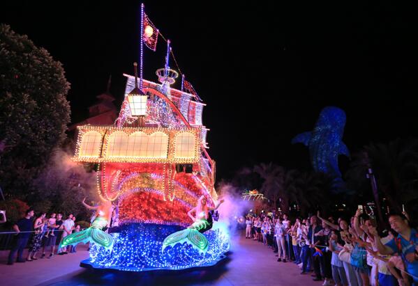 8輛花車分別是8個不同主題:海洋小精靈、提基活火山、熱帶夜雨林、極光盛宴、深海奇魚、夢幻糖果樂園、海盜船和馬戲彩光。據了解,海洋夜間花車擁有主題公園花車高度之最,最高的花車超過10米!同時,這也是中國第一個與觀眾互動的夜間花車演出、第一個使用煙花的夜間花車巡游,而整個花車隊伍的燈光效果同步配合亦為世界首創。