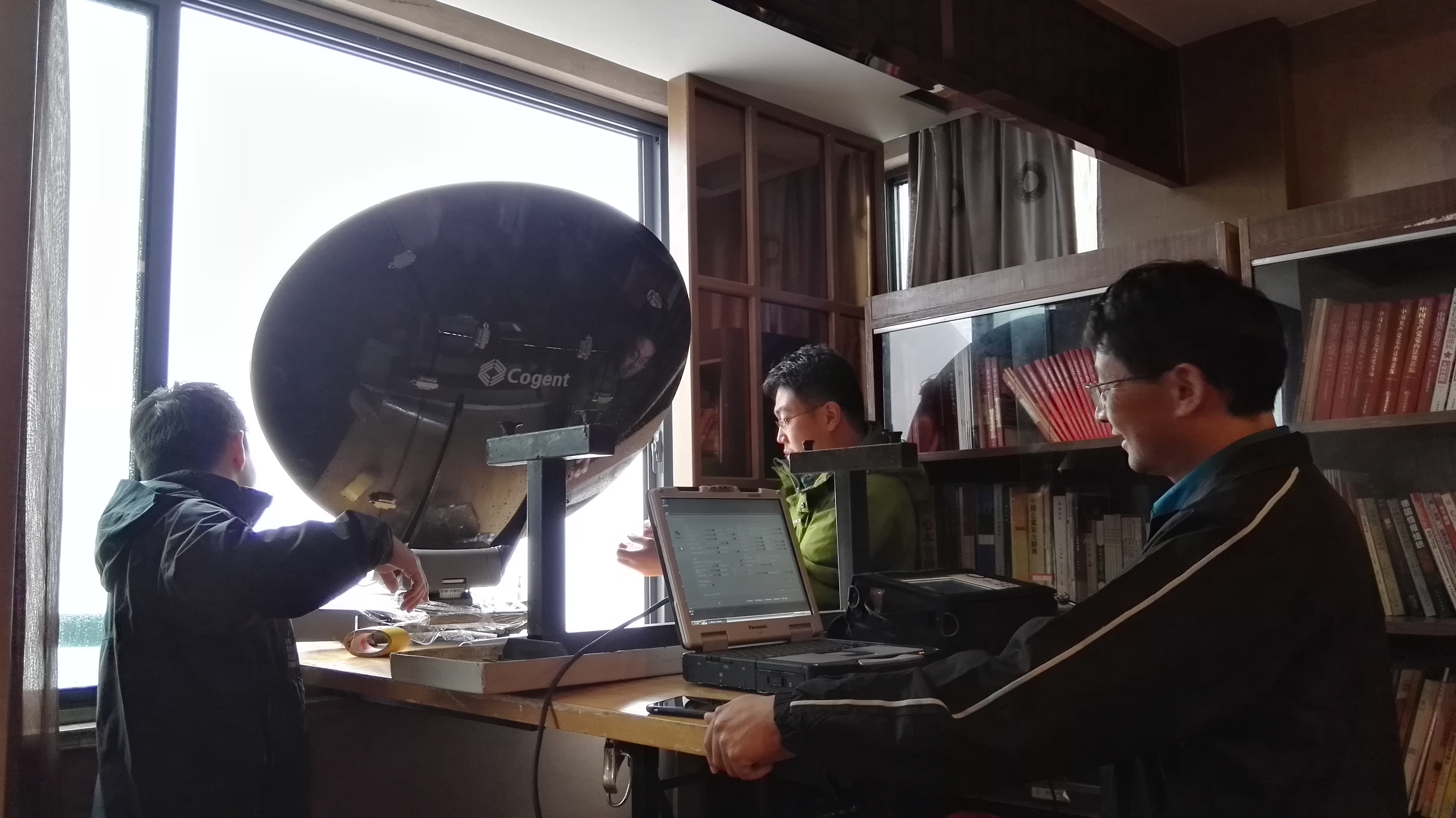 此次直播前夕,正好遭遇台風“鯰魚”過境,從直播組駐紮山上開始,山中一直下著小雨,不時還伴有大風,導播台等設備不能淋雨,但是又必須放在能接收到衛星信號的室外,如何克服這一困難,成為了擺在直播組成員面前的大問題。“一開始在室外擺放了遮陽傘,用以遮擋雨水,但是山上的風太大了,傘多次被吹倒。而且風還夾帶著雨水斜吹過來,根本沒法保障設備安全”,直播組人員介紹。尋找一個合適的位置擺放導播台等設備,抓緊時間與央視後方對接衛星信號,成為了最急切的需求。在玉屏景區到處查看時,玉屏樓賓館二樓的一處窗台映入了大家的眼簾。將窗戶打開,用一個簡易的木床和凳子臨時架設成一個平台,而後將接收設備擺放在平台的一頭,將輸送信號的一面對著外面的天空,另外一頭壓上一些其他設備以保證平台的平衡。如此一來,一個簡易的室內導播台就搭建完畢了,既不影響對外接收衛星信號,同時利用屋簷又能有效遮擋雨水。有人將之稱為:“直播之窗”。“方法總比困難多啊”,所有直播人員忍不住感慨。