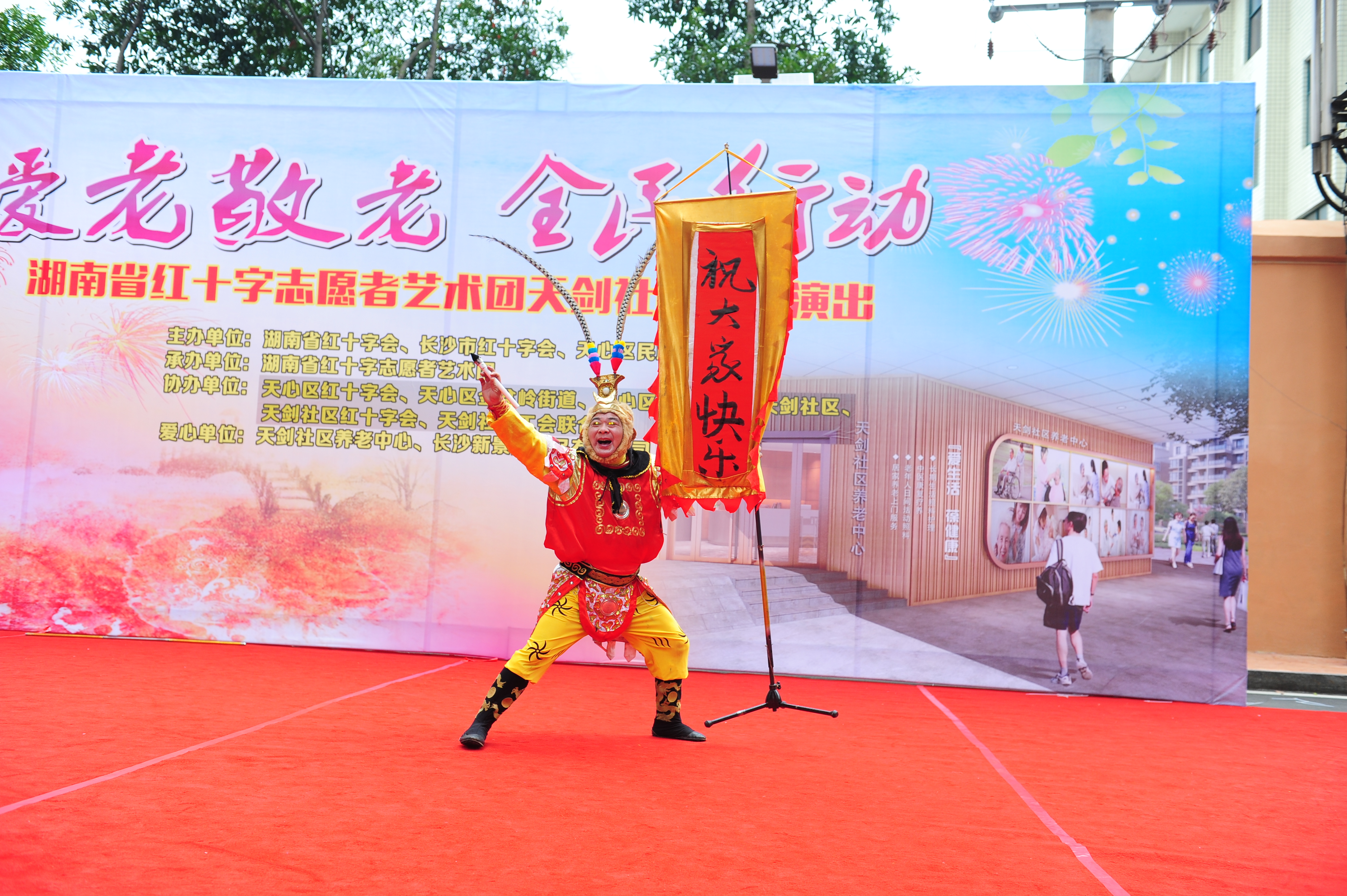 10月8日上午,天心區天劍社區廣場上人頭攢動,熱鬧非凡,來自天心區的300多名老人齊聚一堂。演出由湖南省紅十字志愿者藝術團博愛合唱隊大型原創節目《同一個愛》拉開帷幕。藝術家們表演了老人們喜愛的花鼓戲《劉海砍樵》、《小姑賢》和戲曲《夫妻雙雙把家還》;民歌手英子身著苗族服裝深情演唱《大地飛歌》;歌唱家周京霞的京韻大鼓《四世同堂》主題曲帶老人們回憶過去;省紅十字志愿者風傳奇藝術團20余名舞蹈老師傾情表演蒙古舞蹈《塔林呼恒》;楊建新老師的《金猴獻瑞》及本土笑星的小品《智力測驗》閃亮登場。節目在著名歌唱家王宣之領唱的《共圓中國夢》大型歌舞中結束。慰問演出現場,歡聲笑語不斷,掌聲此起彼伏。