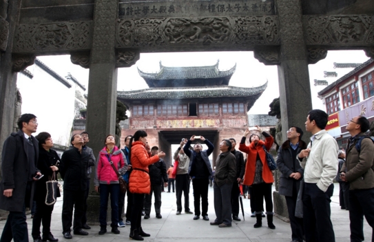 來自海內外的教授、專家、學者在歙縣徽城鎮中和街八腳牌坊下實地調研徽文化與當代價值結合情況