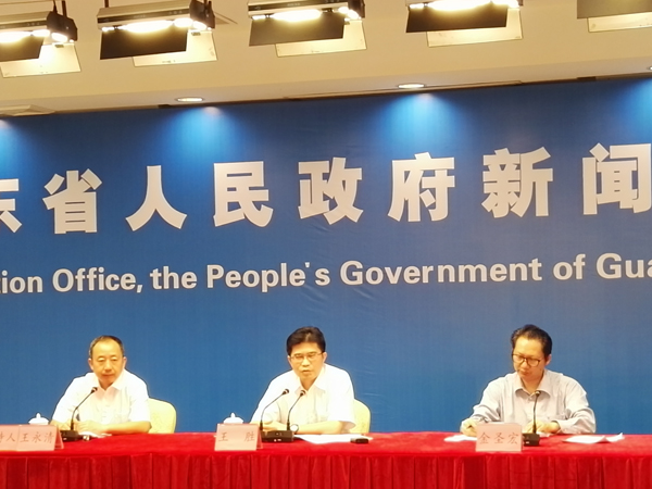 廣東省人民政府新聞辦副主任王永清(左一)、雲浮市市長王勝(中)、雲浮市副市長金聖宏(右一)