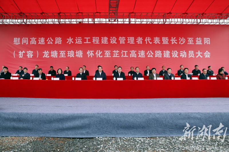 長沙、益陽、懷化、婁底市政府主要負責人在會上作表態發言。來自長益(擴容)、龍瑯、懷芷、龍永、安邵、大岳、婁衡、潭邵大修、土谷塘航電樞紐等高速公路、水運工程項目的建設和管理者代表參加動員大會。