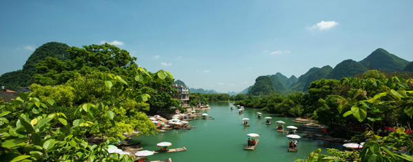 遇龍河兩岸山峰清秀迤邐,連綿起伏,形態萬千,江岸綠草如茵,翠竹蔥郁,樹木繁蔭。遇龍河的水如同綠色的翡翠,清澈透亮,魚兒閒遊,水筏飄搖,一一可見。微風拂過水面,泛起陣陣漣漪,如同小提琴奏出的音符,靜靜的,輕輕的