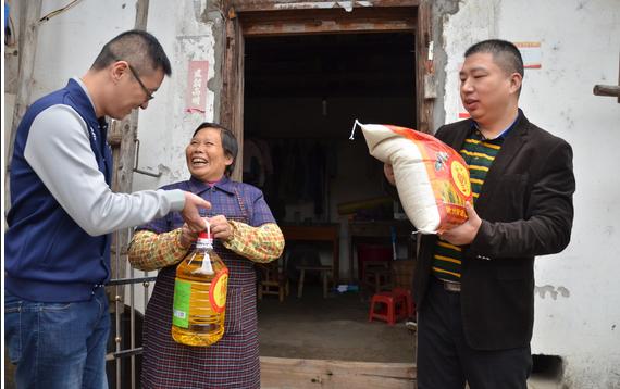 贛州江蘇商會愛心人士將糧油送到五保戶家中。