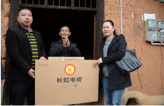 贛州江蘇商會會長劉嬪和支部書記卞志勇為八旬老黨員送上電視機。