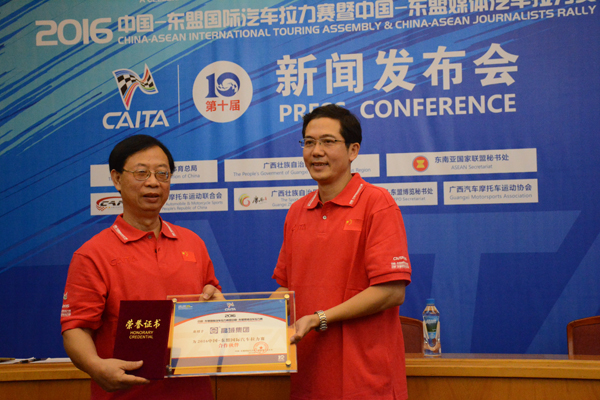 广西壮族自治区体育局向拉力赛赞助商颁发荣誉证书