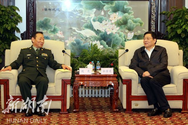 杜家毫代表省委、省政府歡迎魏亮一行來湘調研指導工作。他說,黨的十八大特別是中央軍委改革工作會議以來,國防和軍隊改革加快向前推進,充分體現了以習近平同志為核心的黨中央建設鞏固國防和強大軍隊的決心意志和使命擔當。湖南是兵員大省、軍工大省,有著擁軍優屬的光榮傳統。我們將堅決貫徹落實黨中央、中央軍委和習主席關于改革強軍的戰略部署,進一步落實黨管武裝要求,堅決擁護支持國防和軍隊改革,切實加強國防動員和后備力量建設,著力推動軍民融合深度發展,不斷鞏固和發展“同呼吸、共命運、心連心”的軍政軍民關系。