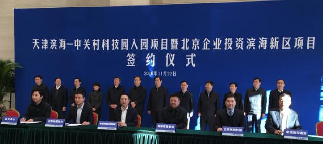 揭牌儀式後,濱海-中關村科技園入園項目暨北京企業投資濱海新區項目進行集中簽約。據悉,今年以來,為深入貫徹落實京津冀協同發展戰略,加快建設濱海-中關村科技園,在京津兩地的共同推動下,一大批北京企業到濱海-中關村科技園考察並表達了明確的投資意願。這次共有45個項目集中簽約,總投資規模超過350億元。項目涉及移動互聯網、融資租賃、跨境電商、健康醫療、國際教育、孵化器建設等多個領域。其中,進駐“濱海-中關村科技園”的項目有百度雲中心、華夏銀行、北京城建、海澱國投、中關村科技擔保、科技租賃、中技知識產權等24個,進駐科技園輻射區的項目有6個,進駐新區其他功能區的項目有15個。