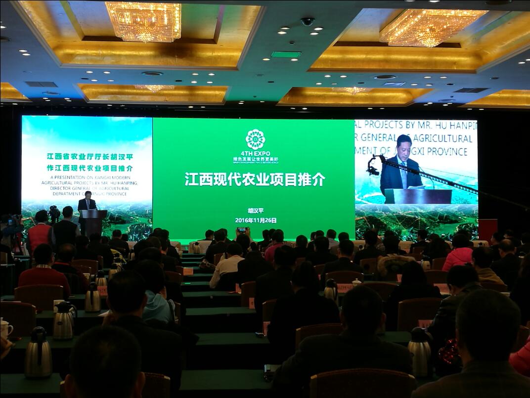 【香港商報网訊】記者萬柔、黃穎報道:26日下午,第四屆世界綠色發展投資貿易博覽會的專題活動之一—— “江西現代農業項目推介會”在南昌舉行。江西省副省長尹建業、省政府副秘書長宋雷鳴、省農業廳黨委書記陳日武、省農業廳廳長胡漢平等出席會議,赤道幾內亞農業、畜牧和食品部部長梅萊,中國科學院院士謝華安,以及沃爾瑪、孟加拉BAY集團跨國公司、北京二商集團、新希望六和集團、華大農業集團等一批境內外知名企業、集團高管,龍頭企業、行業協會代表,農業投資商、采購商共約270多人參加了推介會,敘友情、促合作、謀雙贏。