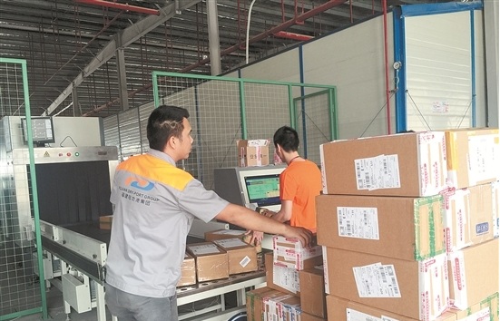 图为在泉州国际快件通关中心,工作人员在查验进口包裹。