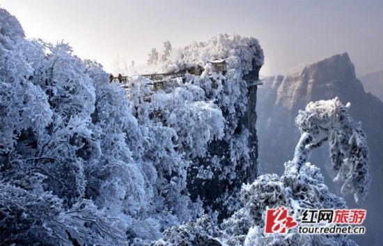 天門山景區:天門山山頂相對平坦,有發育典型的巖溶臺地絕壁景觀,最高處海拔1518.6米,在霧凇冰雪奇觀頻現的冬季,非常適合山頂環游。