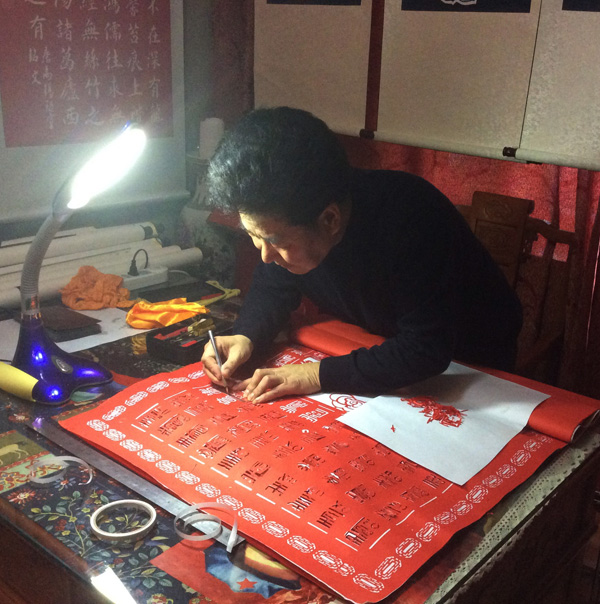 【香港商報網訊】記者寇剛報導:第一次見到楊榮祖先生是在他的創作室裡,接到任務去採訪這位用自己的一把刻刀,把中國非物質文化藝術送上太空的剪紙藝術家,當時他正在心無旁騖的創作《百壽圖》,在燈光下,這位老人顯得那麼專注,刻刀一絲不苟。不忍打擾的我則趁機參觀他的創作室,與其說創作室倒不如說是騰出來的一間臥室,除了刻桌,屋子其他地方都擺滿了他的作品。不僅是這間屋子,其他的臥室也都化身成為其作品的“庫房”,他家不算小,客廳、臥室都是古色古香的傢俱,牆壁上掛滿了其一幅幅經典之作,整個家裡倒也顯得不那麼寬敞了。