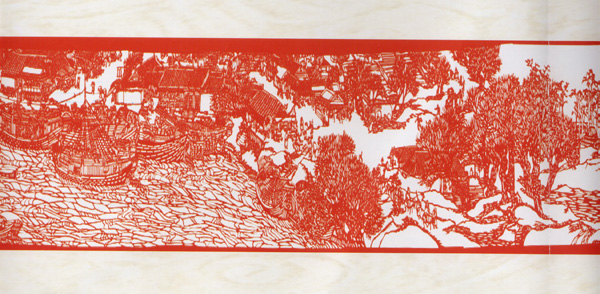 交談之余,楊老拿出自己從2011年5月開始創作,歷時一年精雕細刻完成的長42米,寬0.52米的《水滸一百零八將》長卷剪紙作品,作品上水滸人物栩栩如生,惟妙惟肖。隨後他又取出自己耗時一年創作的長11米,寬0.52米的剪紙作品《清明上河圖》。值得一提的是該作品於2013年6月被製成航太藝術晶片,搭載神舟十號遨遊太空,使剪紙有史以來第一次躋身高科技領域。此外,其部分作品被美國夏威夷皇宮、英國、加拿大等國以及湖南韶山毛澤東懷念館、延安革命紀念館、甘肅省圖書館、甘肅省博物館等多家單位作為館藏之物收藏。