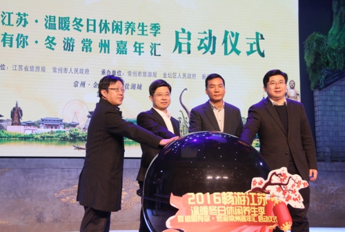 【香港商報網訊】記者戎晨報道:12月16日,2016“暢遊江蘇·溫暖冬日休閑養生季”暨“感恩有你·冬遊常州嘉年彙”啟動儀式在金壇東方鹽湖城度假區舉行。江蘇省旅遊局副局長經聖賢、常州市副市長方國強、常州市旅遊局局長喬俊傑、金壇區副區長劉明江共同啟動嘉年彙。