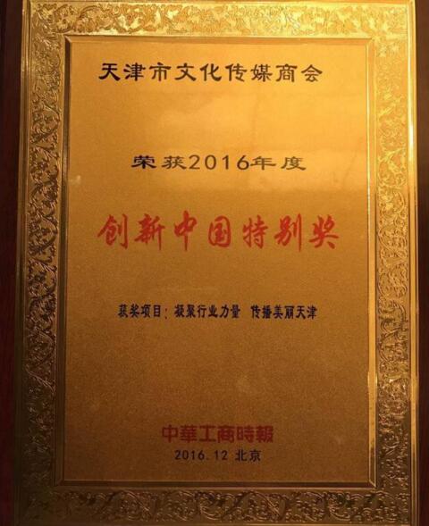 作為天津唯一入選單位,天津市文化傳媒商會,在經過材料審核、網絡投票及最終審核后,最終斬獲《2016“創新中國”工商聯(商會)工作特別獎》。天津市文化傳媒商會會長趙月月、執行會長龍濤代表商會參會并上臺領獎。