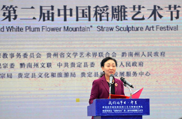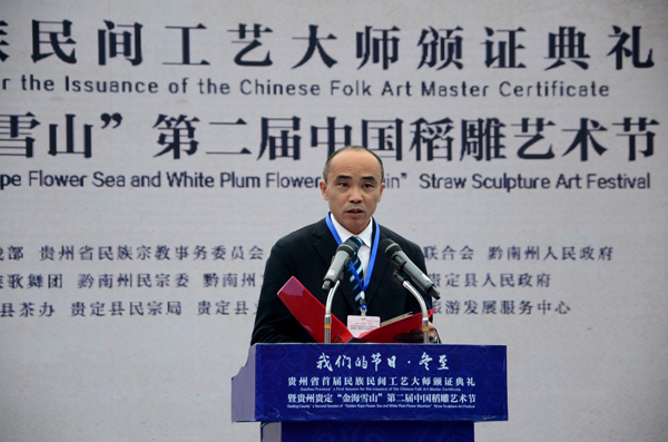 貴州省民宗委黨組書記、主任向紅瓊在講話中說,貴州是一片民族文化的沃土,如何在這片沃土上種出各民族文化百花齊放、百家爭鳴的生動場面,結出各民族共同團結奮鬥、共同繁榮發展的累累碩果,離不開一批技藝精湛、德藝雙馨的“園丁”。此次民族民間工藝大師評選頒證活動,旨在適應新形勢下人才結構戰略性調整和產業結構優化升級的要求,深入挖掘、整合全省民族民間工藝人才隊伍,樹立貴州民族民間工藝人才培養正確導向,進一步推動民族民間工藝事業發展壯大。同時,在風景如畫的“金海雪山”舉辦此次頒證典禮,也是為了充分發揮民族文化助推經濟發展的重要作用,展示民族民間工藝品服務全域旅遊的獨特魅力,積極探索將民族文化產業與民族地區豐富的旅遊資源充分對接的有效模式和將民族民間手工藝品與“吃住行遊購娛”的旅遊業生產力要素緊密聯繫的有效途徑,著力發展民族工業,實現物質文明與精神文明齊頭並進,民族文化與自然風光有機聯動,切實提升民族文化的宣傳力和美譽度,提升景區的豐富性、多彩性。