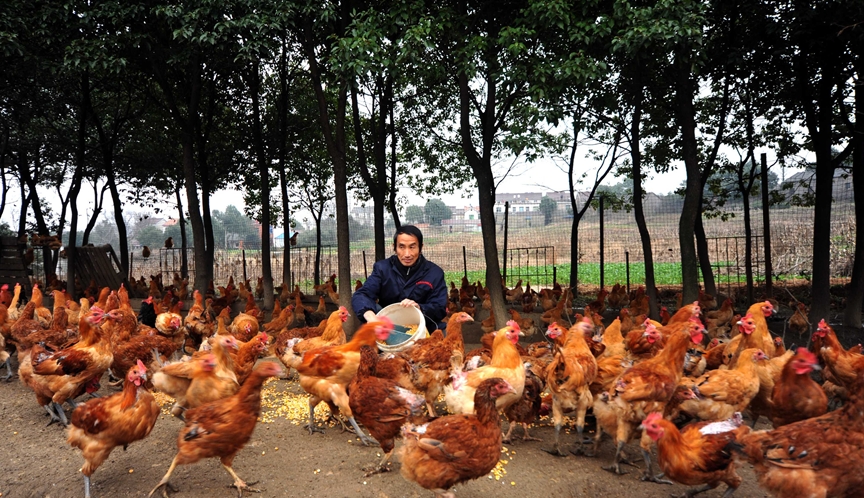 【香港商報網訊】通訊員 周躍東 攝影報道:12月24日,安徽省廬江縣湯池鎮金沖村農民周國能在樹林下用生態穀物飼喂土雞。一年前,周國能在廣東學習新式飼養土雞技術後,回家鄉創辦廬江縣華中生態農業有限公司,運用保健無抗生態養殖技術,讓雞吃蟲草五穀,用中草藥防疫,生態散養等提高雞的免疫力,目前已飼養12700多只麻黃雞喜獲成功,毎只雞獲利50元左右。他還利用互聯網技術將土雞銷往上海、浙江、南京、合肥等地千家萬戶,並獲較好經濟效益。