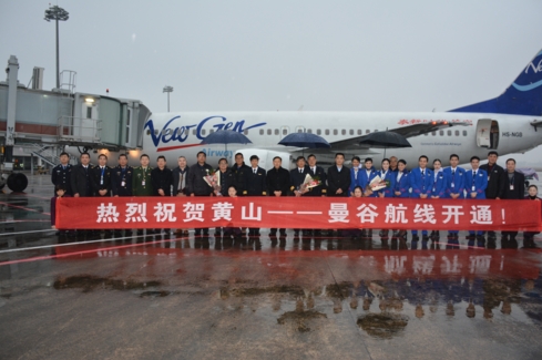 【香港商報網訊】香港商報記者吳敏 通訊員許輝 葉振彬報道:12月26日,經過單程4小時的飛行,來自泰國新時代航空公司的一架B737-400降落在黃山屯溪國際機場,標志著曼穀---黃山包機航線成功首航。黃山機場采用“水門儀式”迎泰客。安徽省旅遊局副局長張健、黃山市政府副市長劉光在機場出席首航儀式並歡迎首批曼穀遊客。