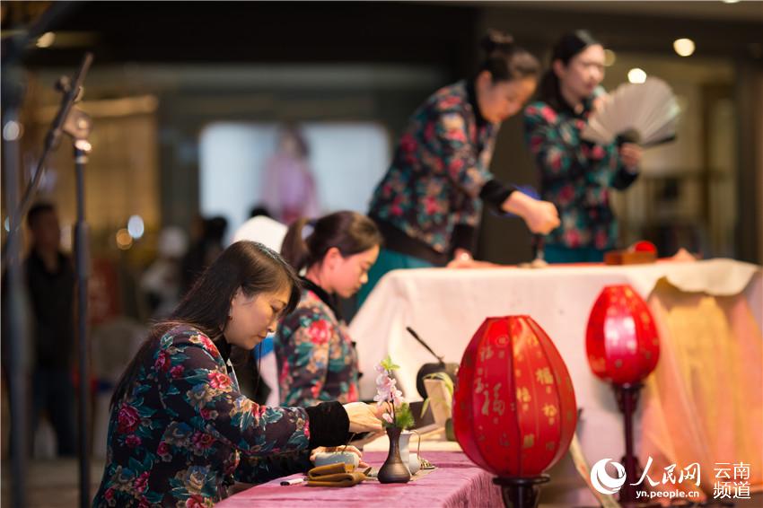 人民網昆明1月3日電 (薛丹)元旦期間,一場由昆明神玉書院和雲南省漢服協會共同舉辦的中華傳統文化的表演活動——“神玉書院·介雅”如期舉行。活動現場,威風凜凜的太極表演和隆重的古代傳統婚禮展示吸引了現場來往的路人駐足觀看,“八雅”表演和花式茶藝讓身處鬧市的觀眾感受到了內心深處的寧靜。不管是花藝師、茶藝師,還是香道師,現場每一位表演者的一舉一動都透露著一種古樸典雅的氣質,都是傳統文化的一種體現。