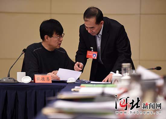 1月8日下午,在分组讨论间隙,甄德恩委员(左)和王立功委员还在就一份联名提案的措辞进行讨论。河北日报记者赵永辉摄