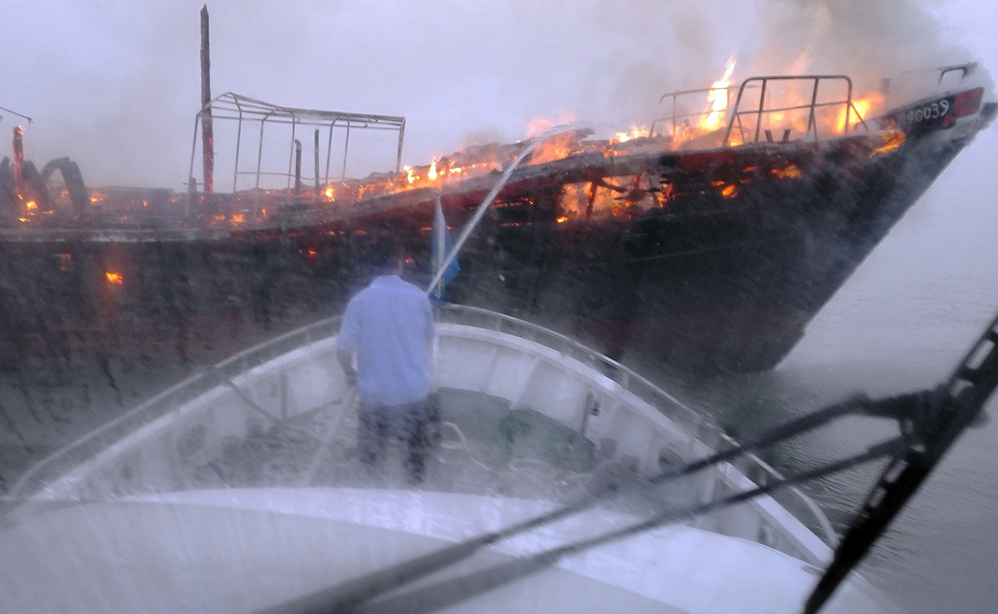 當日6時08分,珠海海上搜救中心接到110轉來報警:在珠海淇澳島對開海域,有一艘20多米長的木質小漁船起火,火勢無法控制,船上2名漁民跳海逃生,被附近作業的漁船救起。接到報警後,珠海海上搜救中心立即協調派出“海巡09170”、“公邊44233”以及“漁政44179”消防船前往事發水域滅火。半小時後,“海巡09170”率先抵達現場,發現漁船火勢猛烈,並伴隨著濃煙,在火勢較為集中的船頭位置,駕駛樓已經燒沒了。隨即,“海巡09170”用船上消防水槍滅火。後在“公邊44233”以及專業消防船“漁政44179”的協助下,經過半個多小時的不斷噴水,船上大火被完全撲滅。