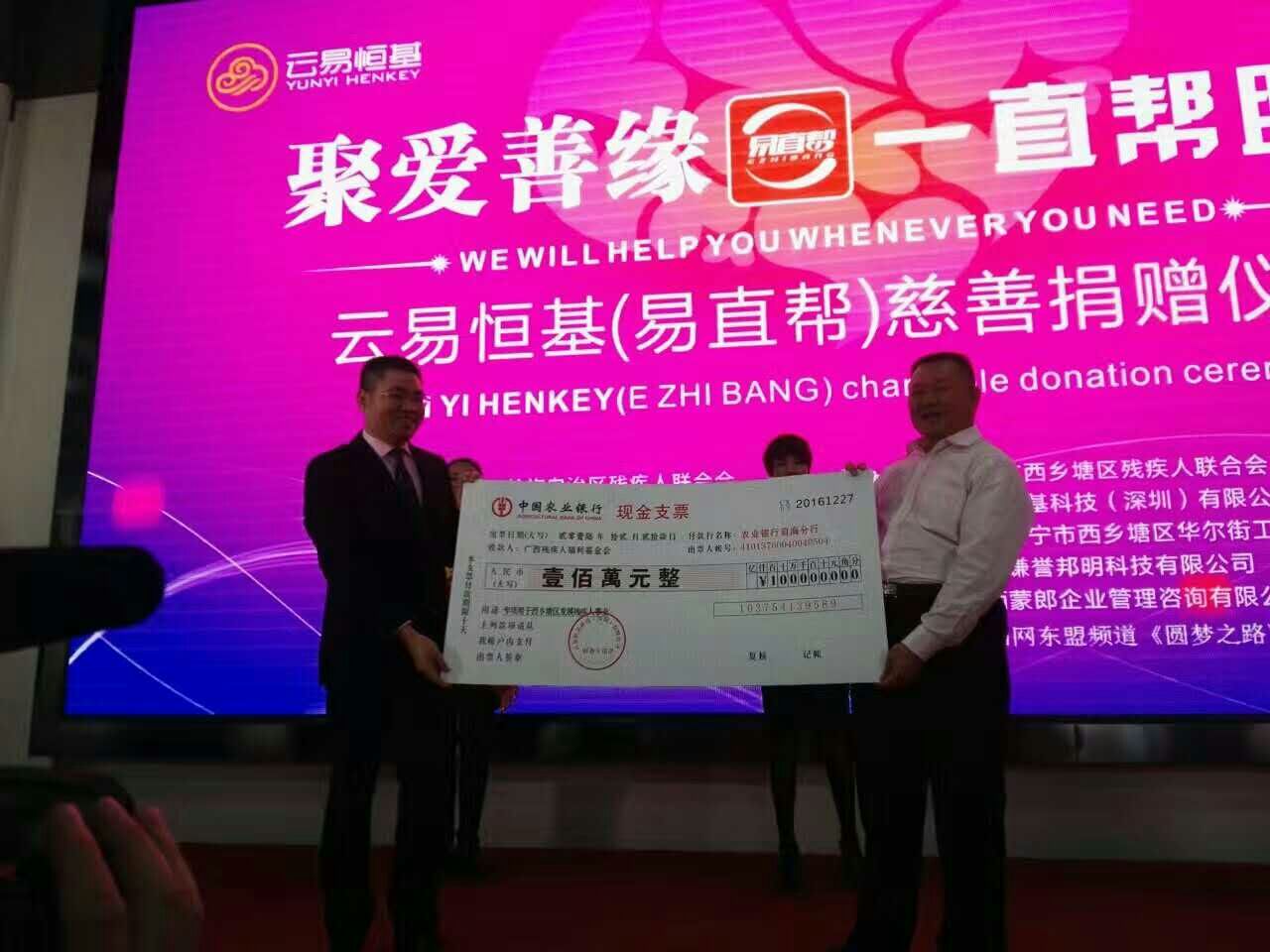 雲易恒基科技(深圳)有限公司董事局主席彭福傑表示,之所以向中共西鄉塘區政府捐贈壹佰萬元用於幫助殘疾人,因為自己是廣西人,願意幫助家鄉的建設。殘疾人是社會的弱勢群體,他們更需要大家的關愛。雲易恒基科技(深圳)有限公司還是一家創業型的公司,暫時沒有更多錢投入慈善事業,壹佰萬太少了,等公司發展好一些,再幫助中國其他殘疾人和做更多的慈善事業。