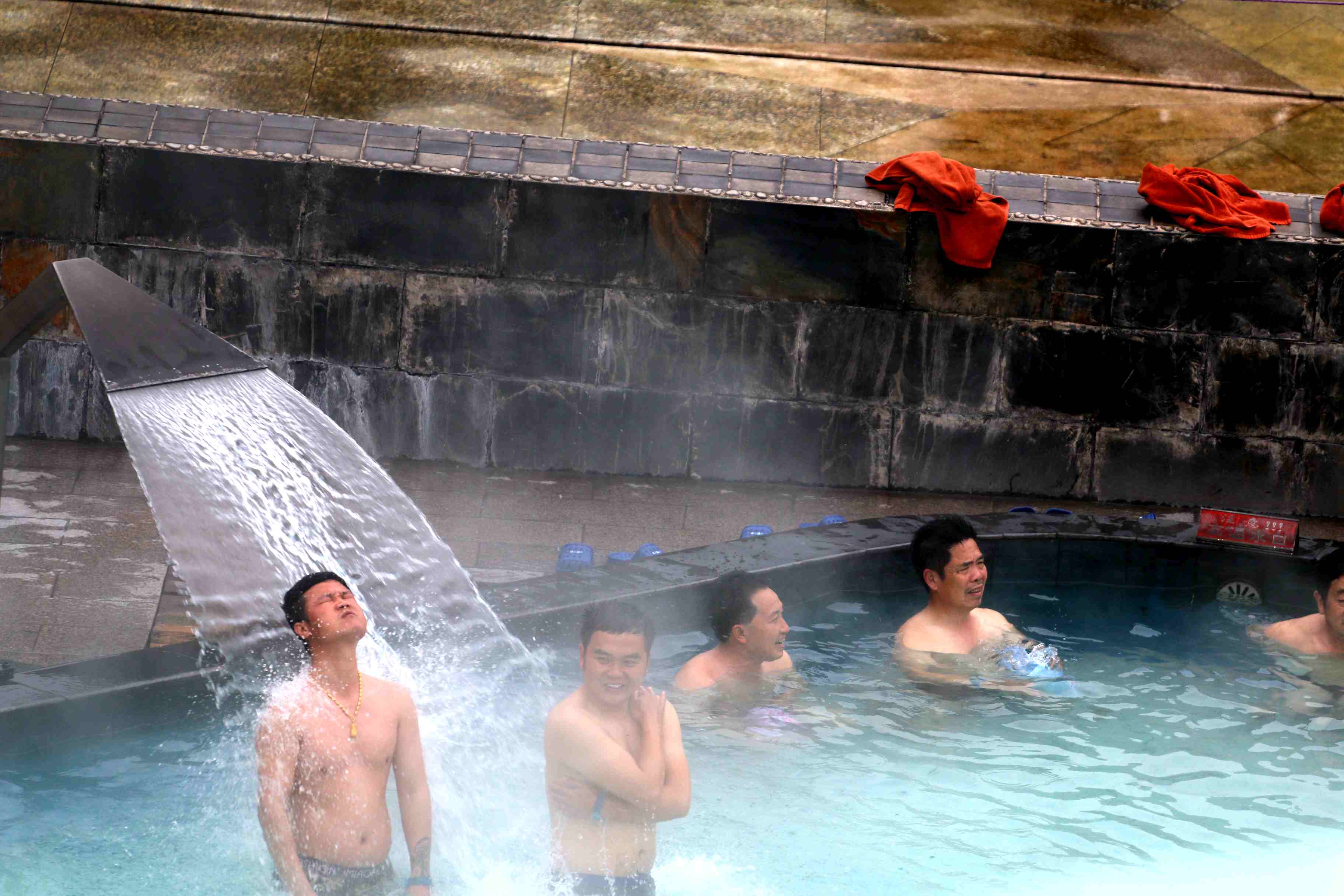2017年1月15日, 遊客在江西省遂川縣湯湖度假村愜意泡溫泉。素有“溫泉古鎮”之稱的江西省遂川縣湯湖鎮,地熱資源豐富,在冬季裏推出冬季旅遊“溫泉季”遊人氣越來越旺,遊人在蒸騰的溫泉水中嬉戲、浸潤,在氤氳的霧氣中養神,自有一番別樣的輕松與愜意。(李建平攝)