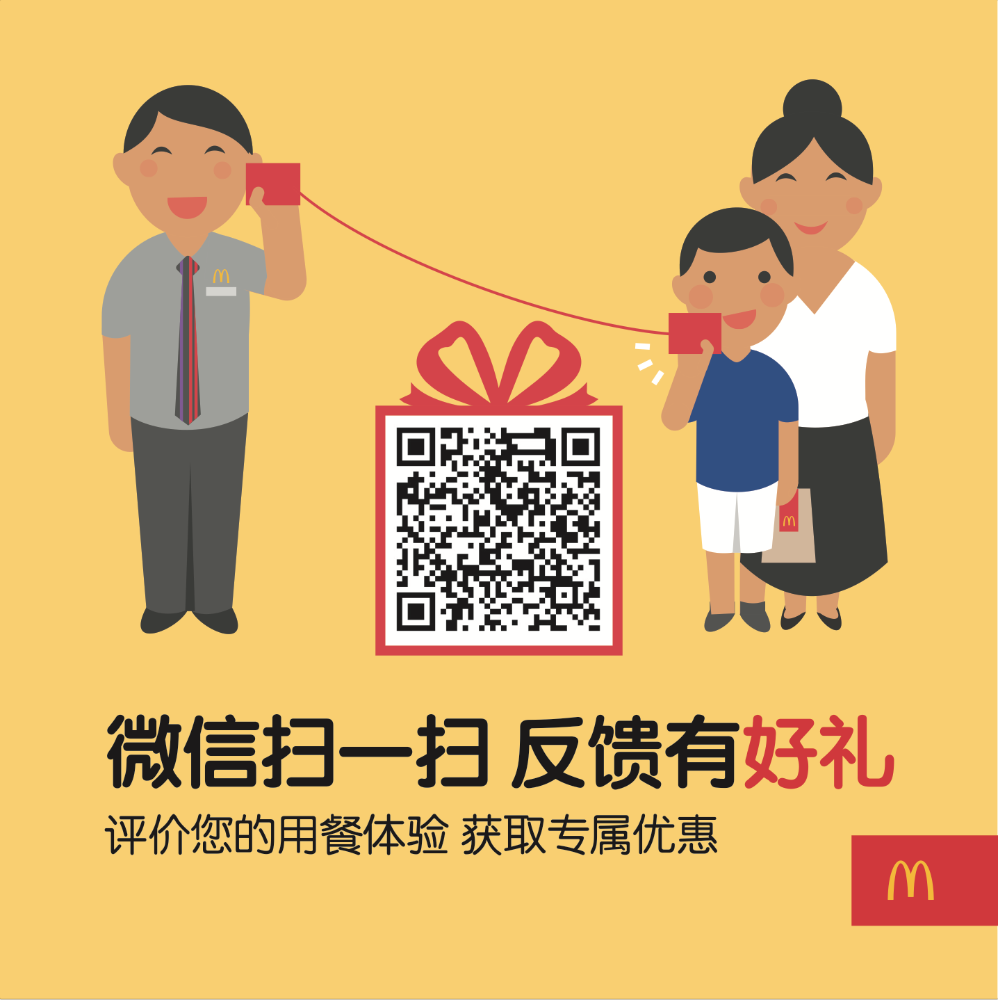 无论在麦当劳餐厅用餐、得来速窗口购餐还是通过麦乐送外送服务订餐,顾客都可以通过移动平台进行反馈:用餐小票背面及餐厅宣传物将印有二维码,微信扫描回复“m”即可进入反馈页面;通过微信、支付宝进行手机支付的顾客,完成支付后还将收到推送信息,点击即可开始反馈;在麦当劳微信公众号回复“m”也可进入平台。顾客只需要约两分钟即可以完成反馈,并将立即收到麦当劳经典产品的优惠券作为感谢回馈。