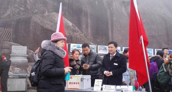 北海宾馆员工章秀枝春节期间已经当了六天的志愿者了。“给游客们指引路线,帮助他们设计合理的旅游路线,游客们都很满意”,特别是大年初三,在章秀枝的帮助下,一位与父母走散的小孩顺利找到了家人,让游客感动不已。“在为游客指路的同时,我们也耐心劝导游客文明旅游,不要乱扔垃圾,在路段上不要随处吸烟,乘坐索道时有序排队等等,游客们也都表示理解,有吸烟的听到我们的话就立刻把烟掐灭了。”如章秀枝这样志愿者的身影,活跃在黄山南大门、北海、天海、玉屏等各个游客集散地,热心的指引、热情的话语,成为文明旅游的一抹亮丽风景。