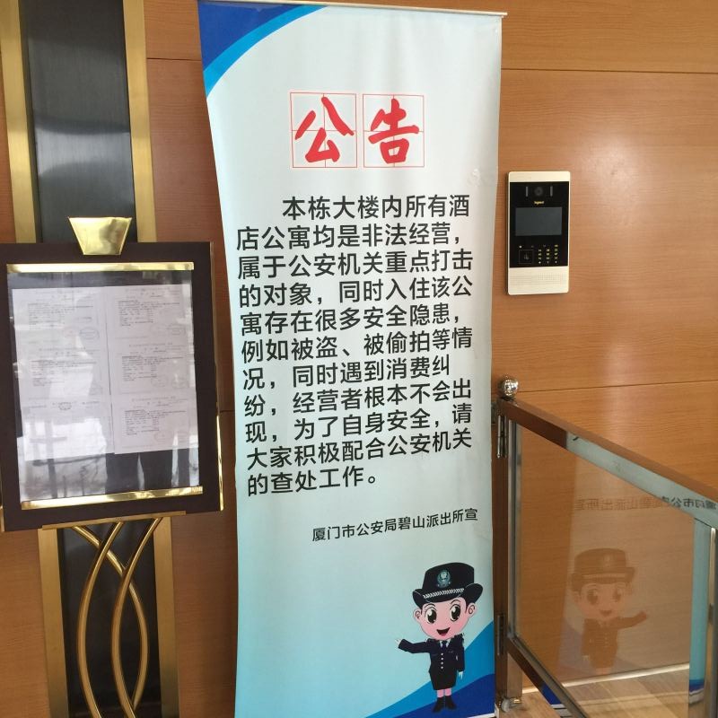 然而,筆者在一棟廈門標志性大樓內,見到公安部門的公示卻稱,本棟大樓的酒店公寓,均是非法經營,存在偷拍、被盜等安全隱患。這讓筆者很納悶,既然存在“非法”,為什么不及時查處?既然市場有需求為什么不規范管理?民宿、酒店式公寓在國內、國外許多城市都有,一個即能解決游客需求,又能解決就業,給經營者帶來財產性收入的“好事”,為什么變得那么“恐怖”? 筆者詢問了住在酒店式公寓的,來自湖南的陳先生,他表示住在這樣的公寓里感覺很舒服,但看到公安部門的公示,心里又感到很不放心。