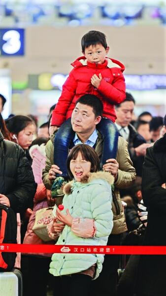 昨日,漢口站候車廳內,一位父親扛著兒子等待檢票 記者胡冬冬 攝(信息來源:張丹夫)