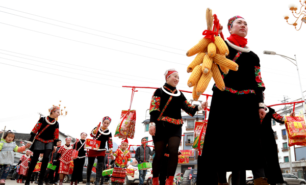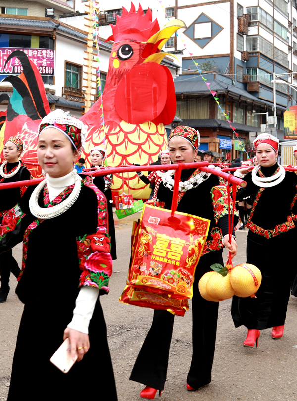 當日,記者在社區大門口看見,4個姑媽們手持大粑粑領隊,其餘肩挑水果、雞鴨、稻魚、豬肉、瓜果、辣椒及美酒等各式禮品。翻年新春到,姑媽們以隆重的傳統禮俗,帶領子女回鄉探親拜年。