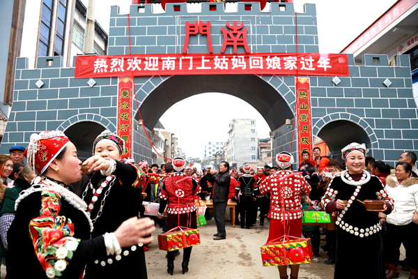 100多人的姑媽隊伍浩浩湯湯進門,受到娘家人隆重迎接。在敲鑼打鼓的喜氣氛圍中,姑媽隊伍接飲一道道招呼酒和攔門酒,迎客隊伍分批為他們接過挑擔,為姑媽與子女披上手帕、圍巾,喜迎回鄉探親拜年。