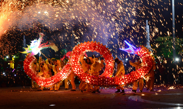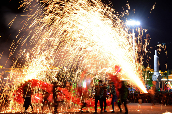 【香港商報網訊】 記者 黃慶松 通訊員 張鴻 報道:2月10日,貴州省黔東南苗族侗族自治州台江縣城內,市民們在噓花中舞龍迎接元宵佳節的到來。據悉,“舞龍噓花”在台江縣有上百年的曆史,耍火龍鬧元宵已成為台江縣最隆重的民間文化狂歡活動。