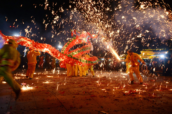 當天晚上,人們利當地民間用自制的土火藥花筒,沿街等候龍的到來,龍剛進入城內,只見舞龍者高喊“花來了、花來了”,噓者手持花筒蜂擁而致,點燃自己手上的花筒,發出“呼呼”的噴射聲直指龍頭、龍身,頓時,火光滔天,猶如波浪,一浪翻過一浪,整個場面驚險、刺激、火爆,故稱“勇敢者的遊戲”。