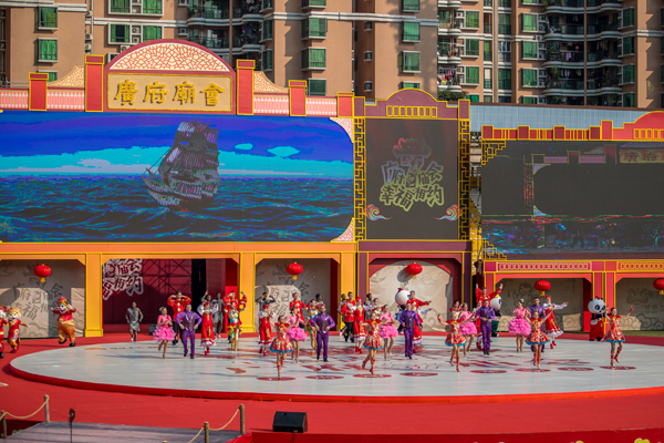 作為廣府廟會的重頭戲,廣府民俗文化大巡演2月12日下午在廣東省人民體育場盛大舉行。廣州是古代海上絲綢之路的發源地,巡游的第一個表演方陣就是“海絲風韻”,展現廣州源遠流長的對外貿易。來自長隆旅游,由“多國精英”組成的演藝隊伍充分體現廣州兼融中外文化的悠久歷史和開放胸懷。
