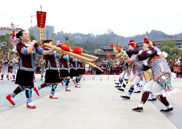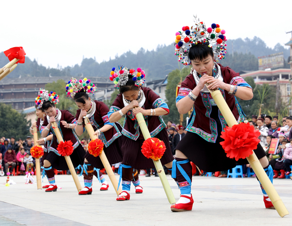 2月10日,人们在三江侗族自治县古宜镇多耶广场吹地筒。