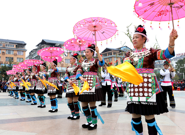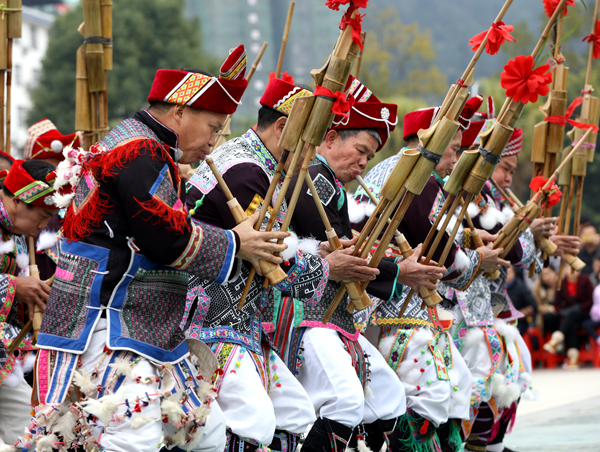 2月10日,人们在三江侗族自治县古宜镇多耶广场吹芦笙。