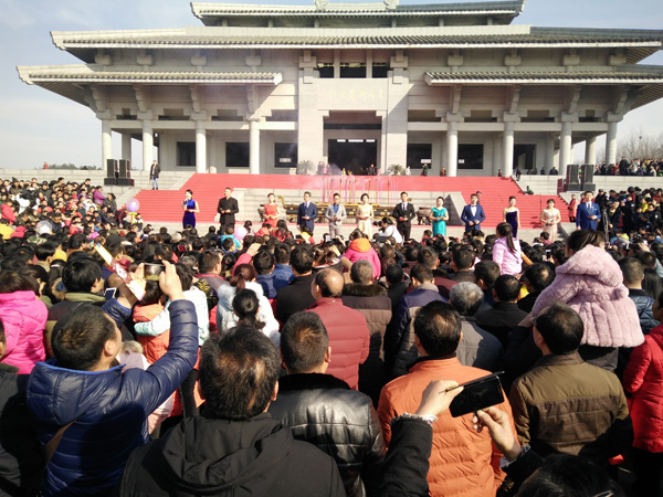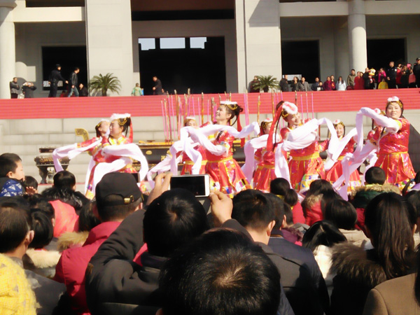 記者在活動現場看到,拜始祖、祈洪福、賞歌舞、猜燈謎、鬧元宵……上午9時許,隨州炎帝故里景區謁祖廣場鐘鼓齊鳴,在莊嚴肅穆的音樂聲中,拜祖祈福活動正式開始。