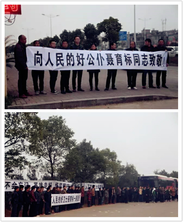 2月18日,聂育标同志的遗体告别仪式在樟树市殡仪馆举行。清晨六点多,尽管天还未大亮,闻讯赶来的市民自发组织,在沿途多个地点拉起横幅送英雄最后一程。