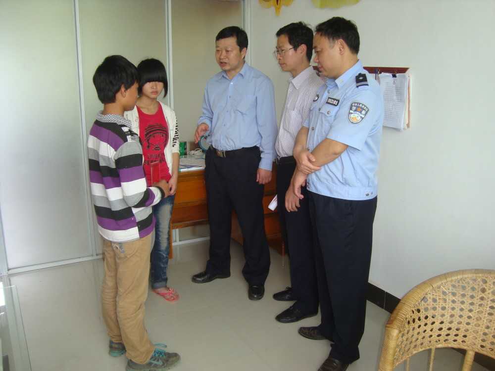 聂育标(左三)生前与派出所民警为困难留守学生捐款。