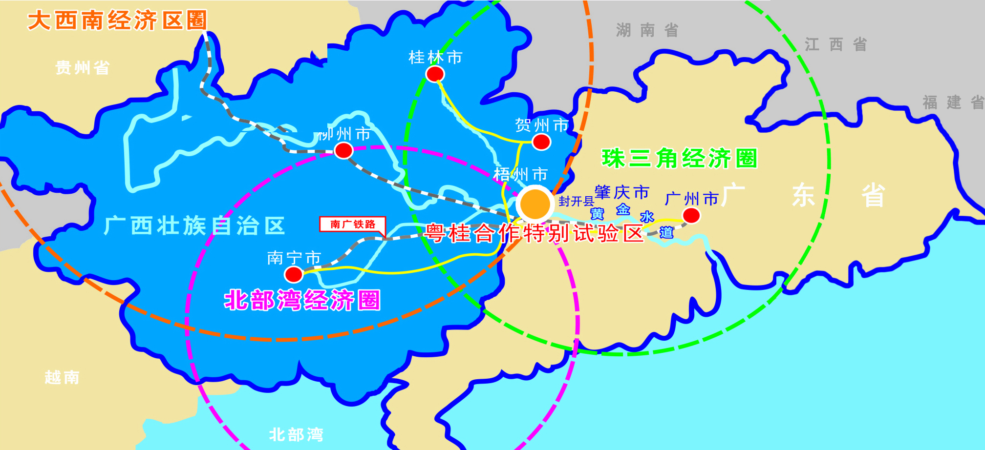 粤桂合作特别试验区在珠三角经济区、北部湾经济区、大西南经济区的区位图