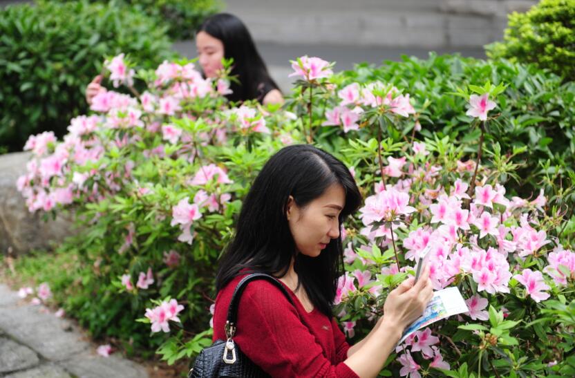 圖為遊客紛紛拿出手機與景區內的杜鵑花拍照合影,享受大好春光。