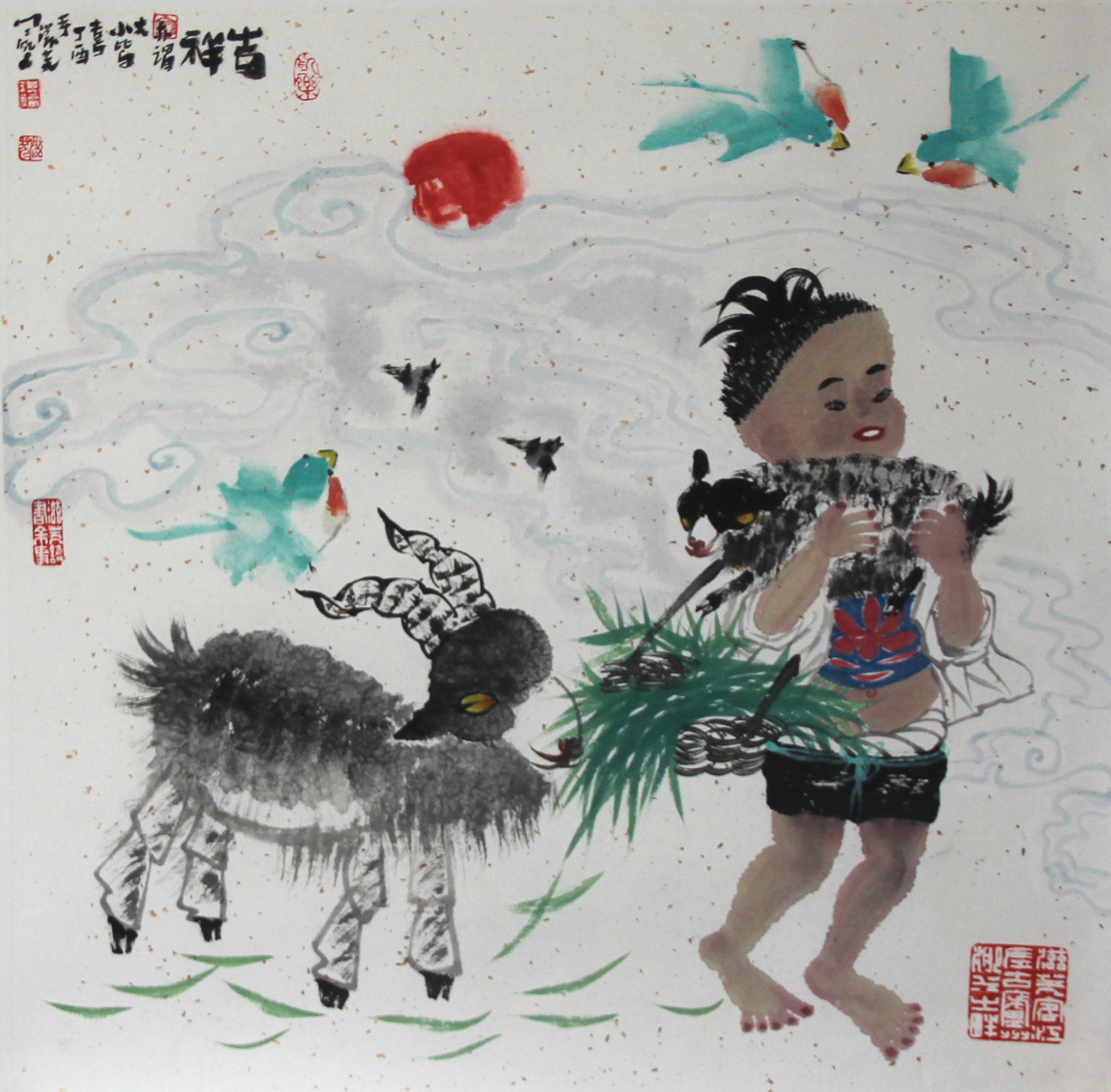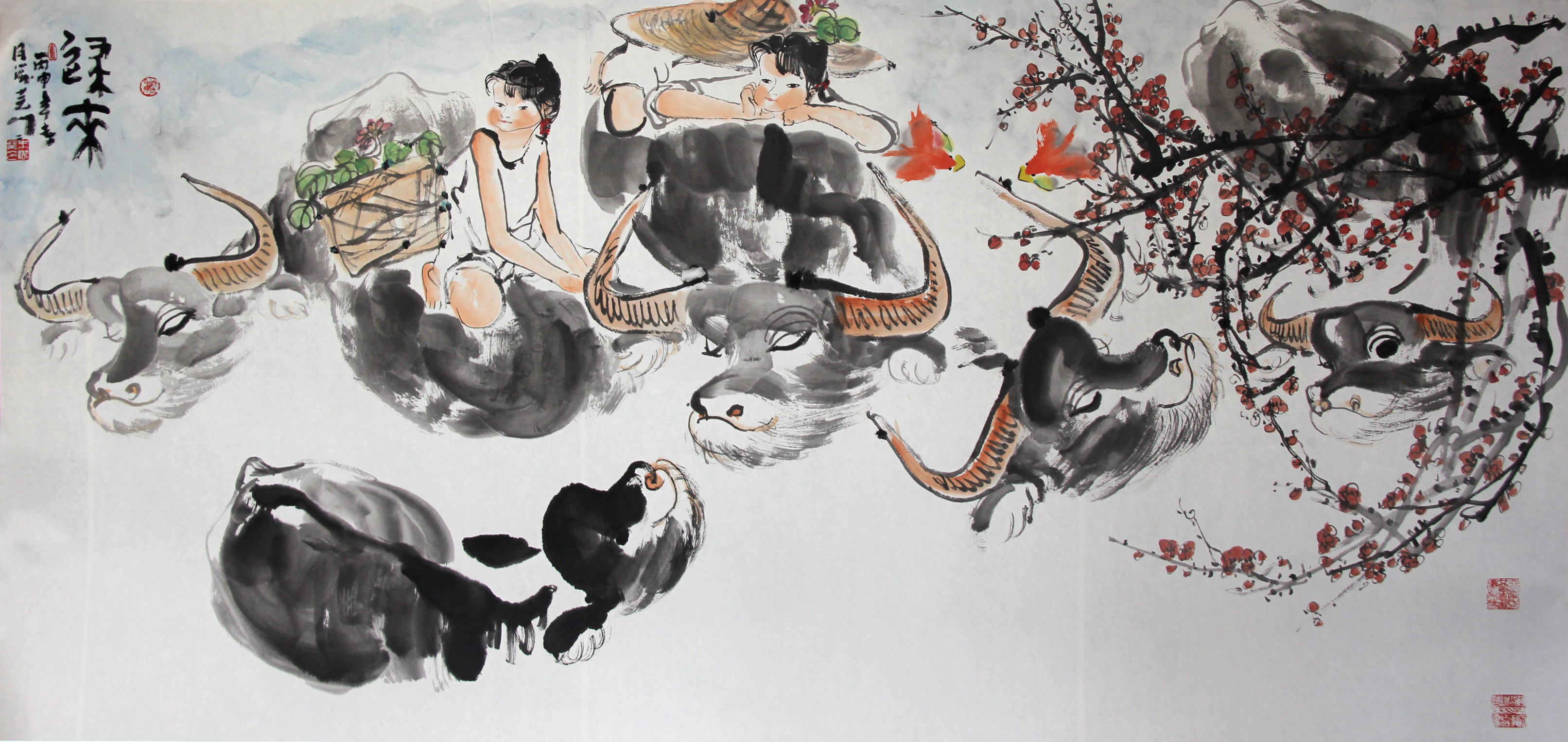 在他的筆下,自然、山川、人物無不含有鮮活的生命跡象。他鍾情於對牛、羊的描繪,更醉心對人和自然結合的書寫。在作品“和美”系列中,有春風浩蕩,燕雀飛翔,水牛臥遊,牧童嬉戲;有山光明媚,墨弦錚錚,青蛙跳躍,村姑微笑……滋蕪用鄉村民風點化,借人與景抒發對生活的愛以及人與自然的和諧之美,為時代存寫,也很好地詮釋了“天人合一”的哲學觀。