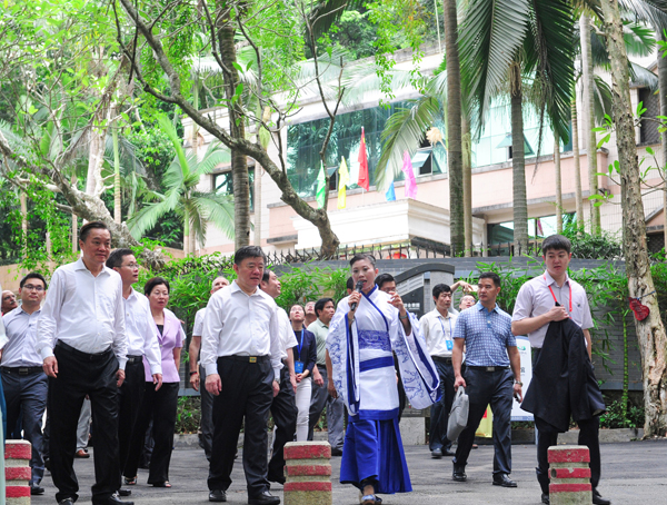 图为第三届中医科学大会期间,曾庆香为参会领导、嘉宾讲解罗浮山的中草药文化。