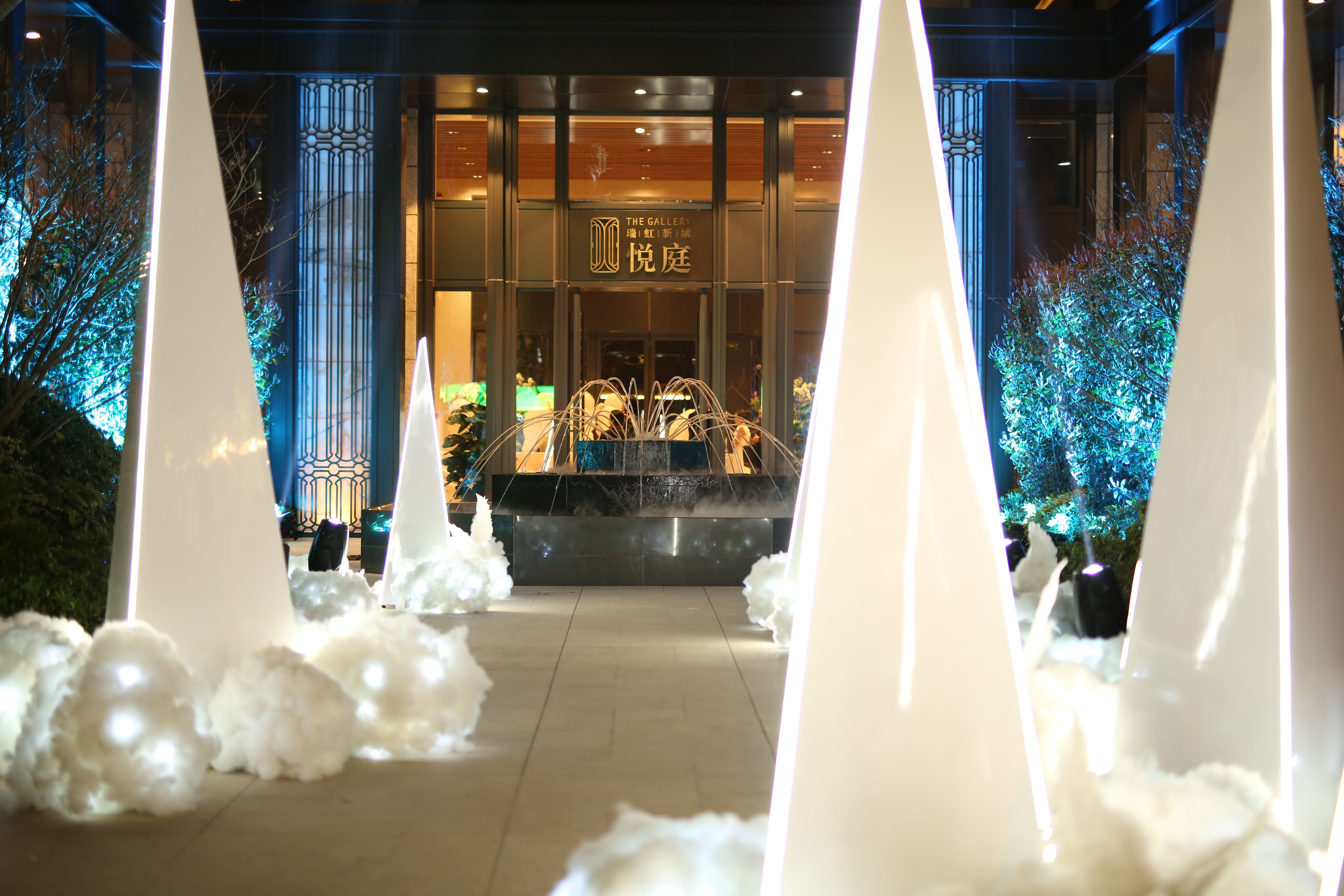 為了迎接這場藝術盛事,悅庭會所也換上了新裝,迎賓大道上佇立著棱形的雲山,燈光勾勒出連綿的群山,曲徑上彌漫著發光的雲朵,置身其中仿佛漫步雲端,以光影的語言營造出一幅夢幻奇觀,把夜色渲染得更為撩人。而兩側翩翩起舞的芭蕾天使則給這幅景象平添了一分靈動。