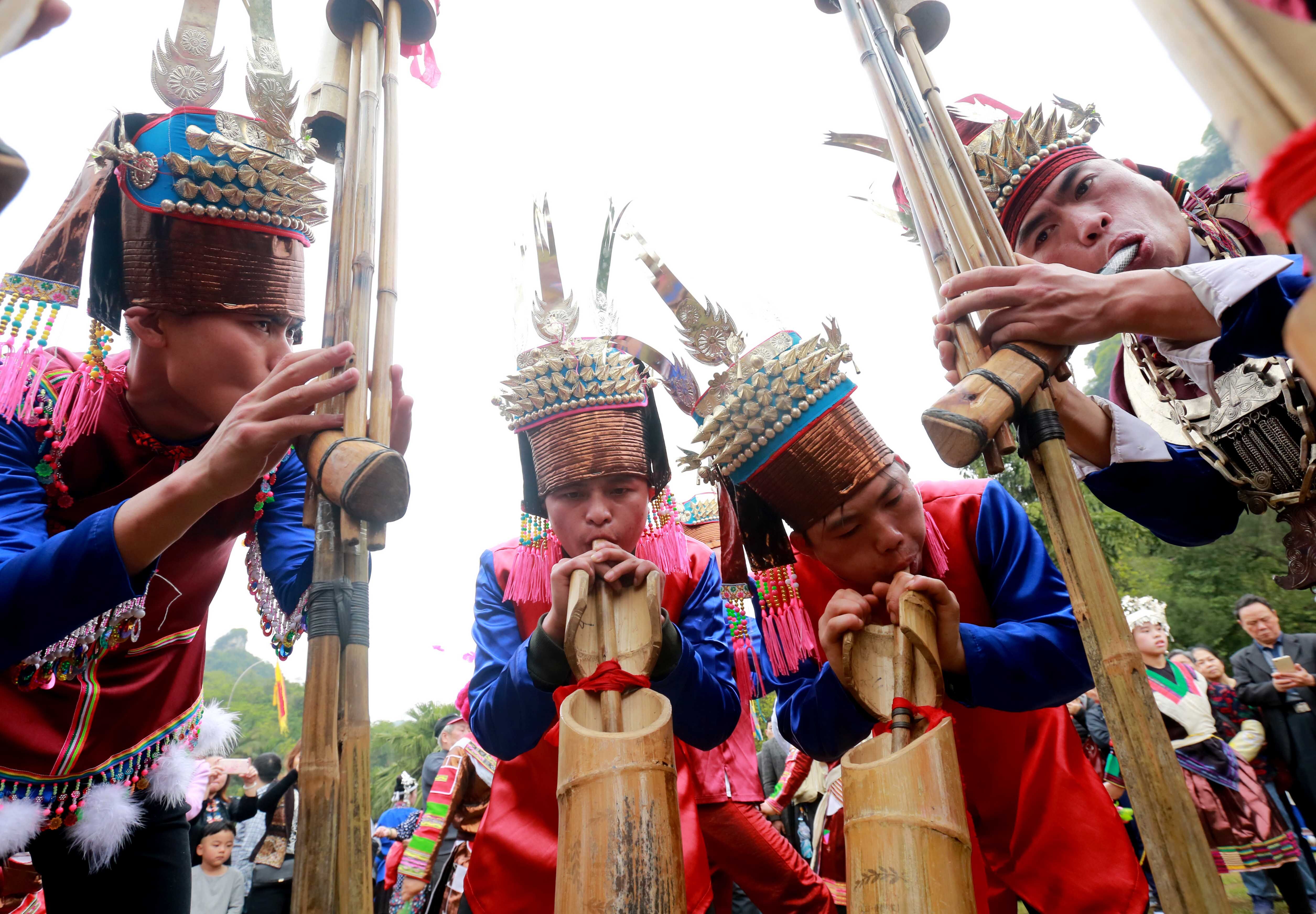 少數民族小夥在吹蘆笙歡慶“三月三”。覃慶和 攝